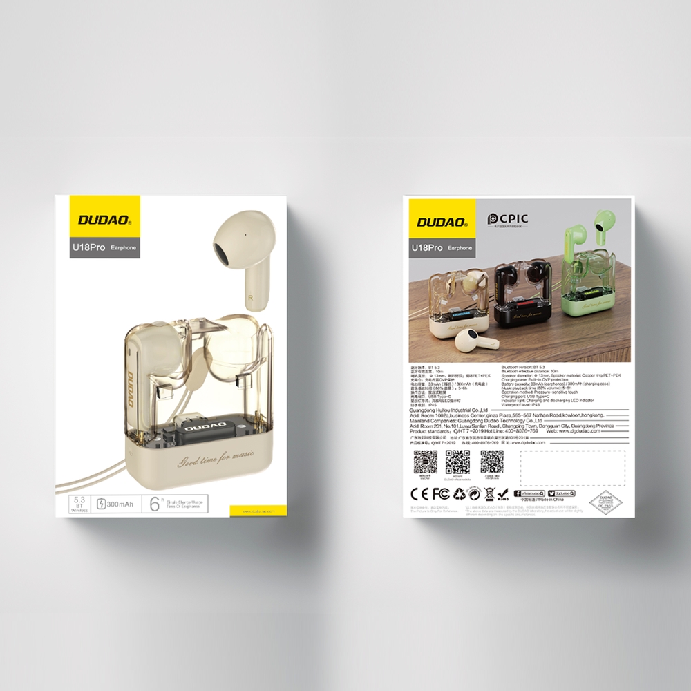 Erleben Sie mit den Dudao U18Pro Bluetooth 5.3 TWS Kopfhörern eine neue Dimension des hervorragenden Klangs. Ihr modernes, transparentes Design macht sie zu einem stilvollen Accessoire für jeden Anlass. Dank der neuesten Bluetooth-Technologie und einer leistungsstarken Batterie sind diese Kopfhörer nicht nur mobil, sondern auch äußerst funktional. Genießen Sie bis zu 5 Stunden Musikgenuss und bis zu 30 Stunden Standby-Zeit, perfekt für unterwegs oder beim Training.